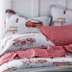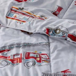 Our crisp, organic cotton percale firetruck print comforter and sham set is as good for the planet and comfy for your little one. Don’t be alarmed; there isn’t really a fire! But our Firetrucks collection is ready for any emergency.